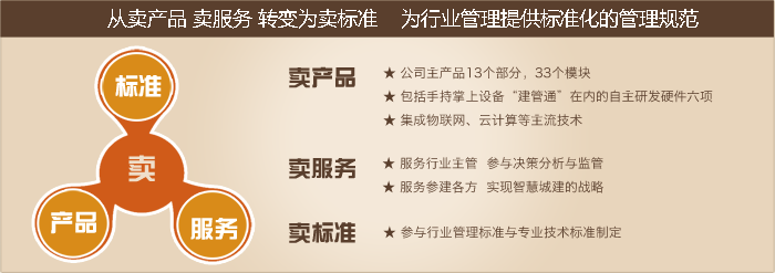 從賣(mài)產(chǎn)品 賣(mài)服務(wù) 轉(zhuǎn)變?yōu)橘u(mài)標(biāo)準(zhǔn) 為行業(yè)管理提供標(biāo)準(zhǔn)化的管理規(guī)范